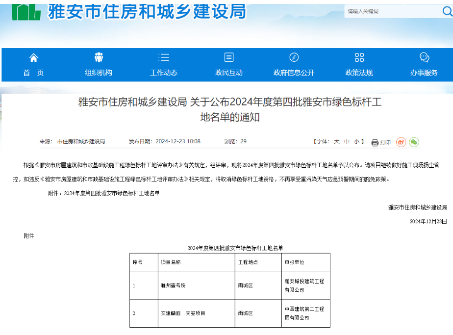 12月23日,雅安市住房和城乡建设局发布了《关于公布2024年度四批雅安市绿色标杆工地名单的通知》,w66利来国际集团蘭庭•天玺项目,以卓越的绿色实践荣获“雅安市绿色标杆工地”殊荣。