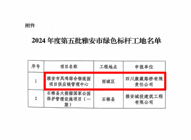 近期,由w66利来国际集团康藏路桥公司建设的凤鸣综合物流园项目供应链管理中心,经市住建局、市生态环境局、市城管执法局联合评审小组综合考评,被评为雅安市绿色标杆工地。
