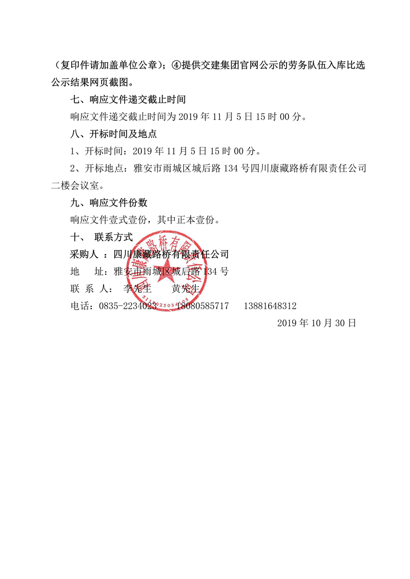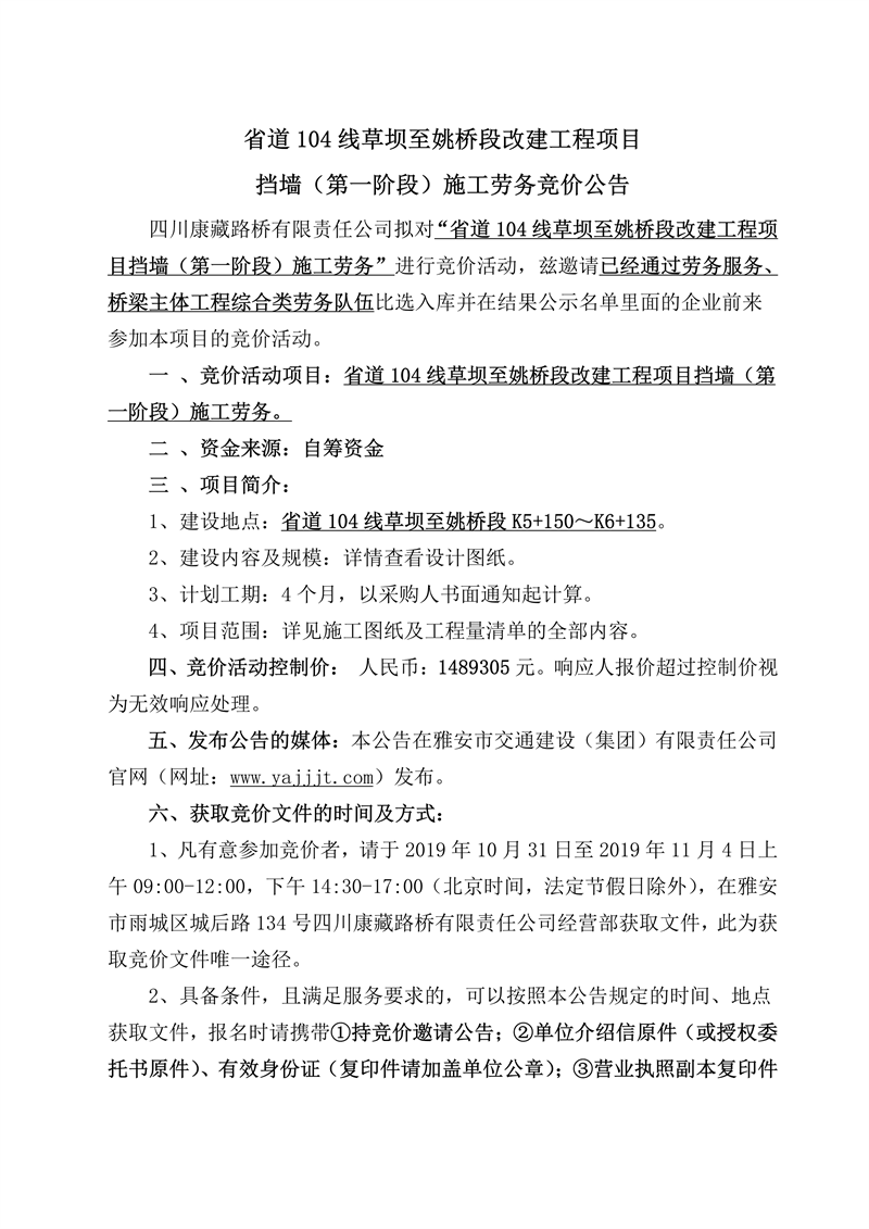 四川康藏路桥有限责任公司省道104线草坝至姚桥段改建工程项目挡墙(第一阶段)施工劳务竞价公告
