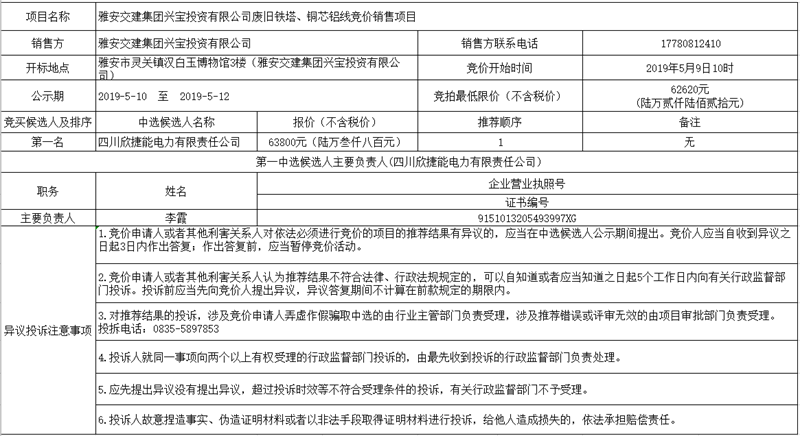 w66利来国际集团兴宝投资有限公司废旧铁塔、铜芯铝线竞价销售项目公示