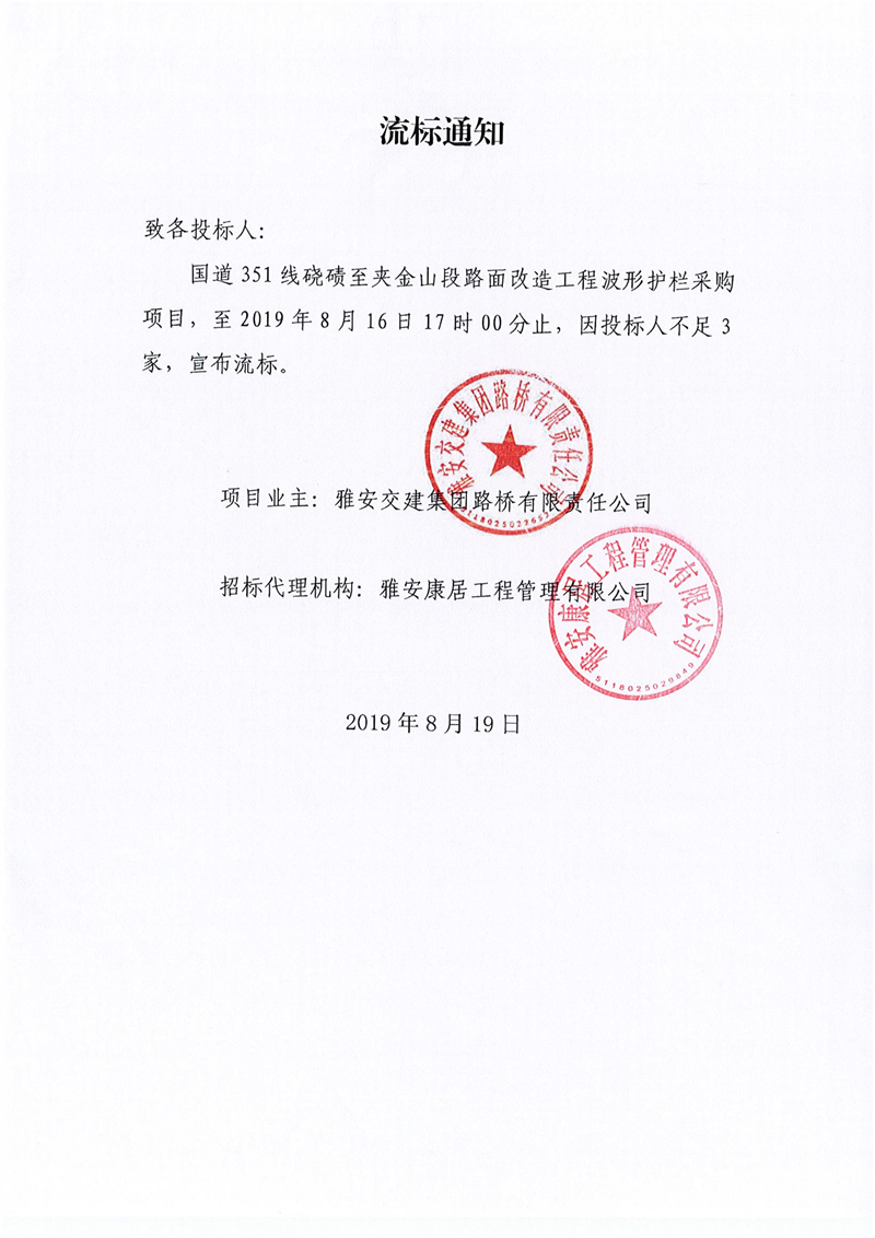 w66利来国际集团路桥有限责任公司国道351线硗碛至夹金山段路面改造工程波形护栏采购项目流标通知