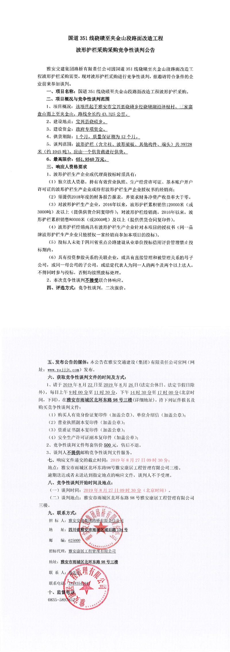 w66利来国际集团路桥有限责任公司国道351线硗碛至夹金山段路面改造工程波形护栏采购项目竞争性谈判公告