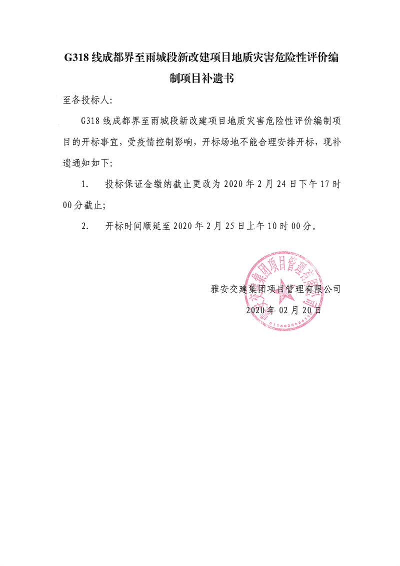 w66利来国际集团项目管理有限公司G318线成都界至雨城段新改建项目地质灾害危险性评价编制项目补遗书