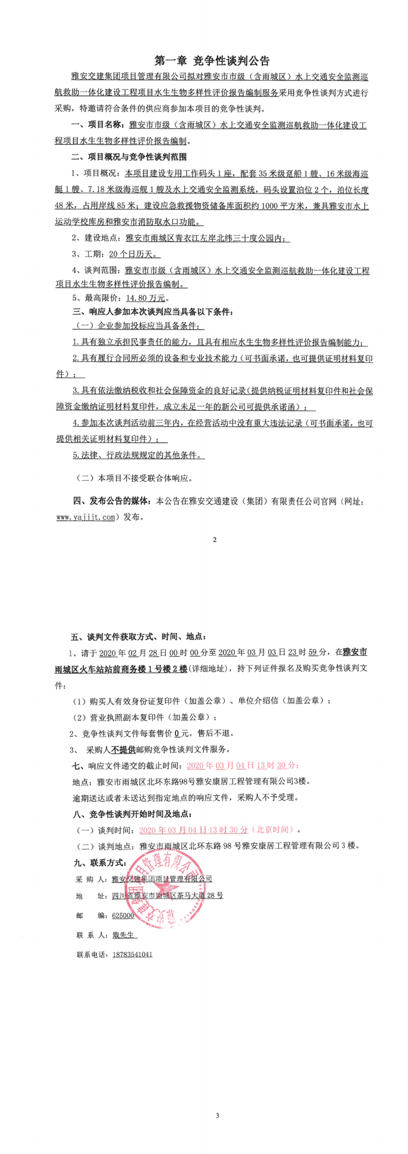 w66利来国际集团项目管理有限公司雅安市市级(含雨城区)水上交通安全监测巡航救助一体化建设工程项目水生生物多样性评价报告编制竞争性谈判公告