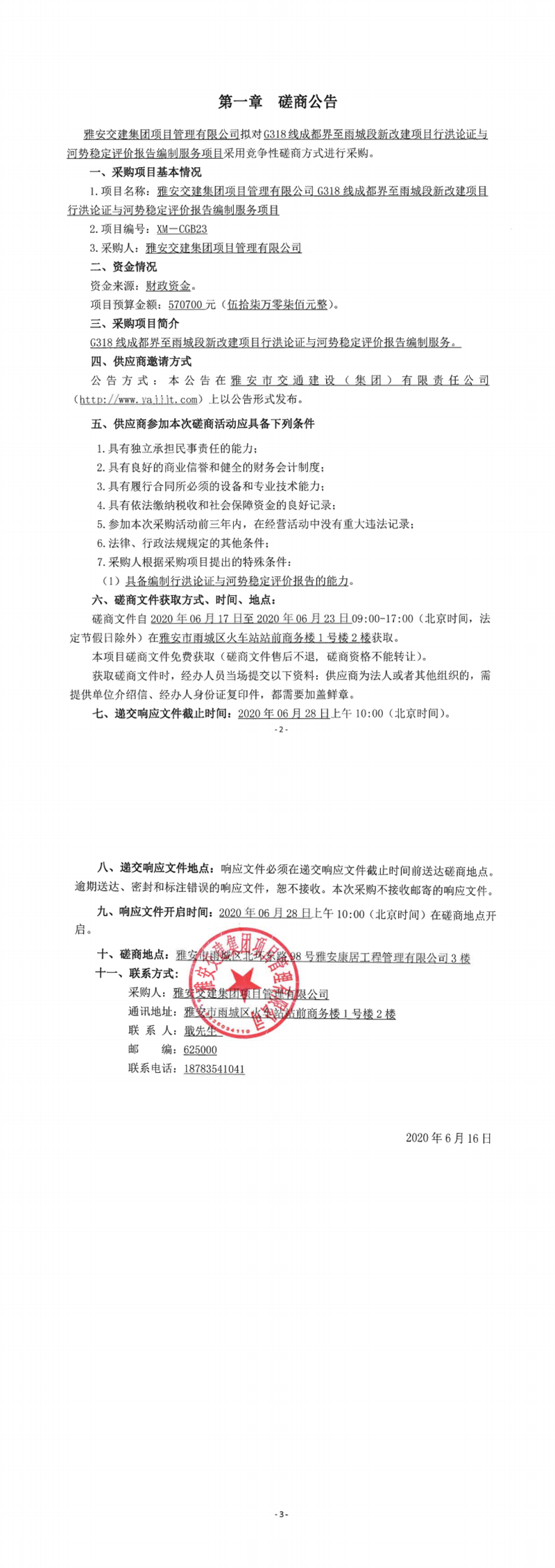 w66利来国际集团项目管理有限公司G318线成都界至雨城段新改建项目行洪论证与河势稳定评价报告编制服务项目竞争性磋商公告