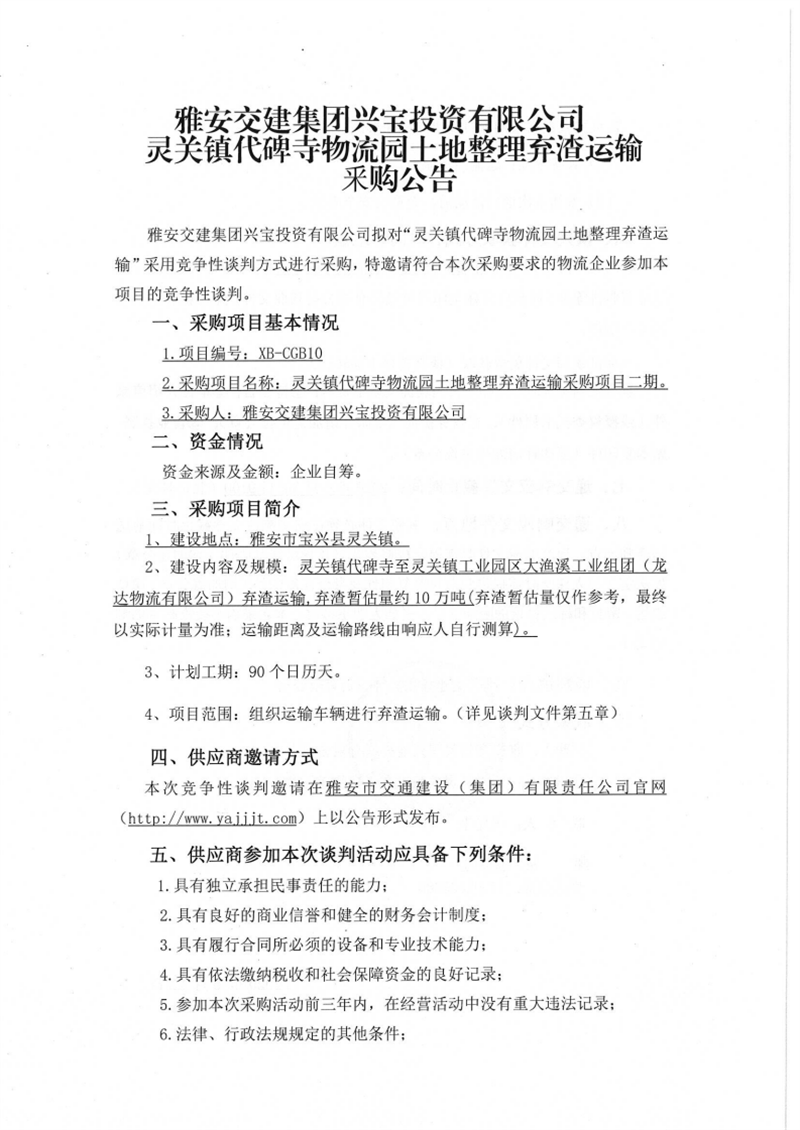 w66利来国际集团兴宝投资有限公司灵关镇代碑寺物流园土地整理弃渣运输采购项目二期竞争性谈判公告