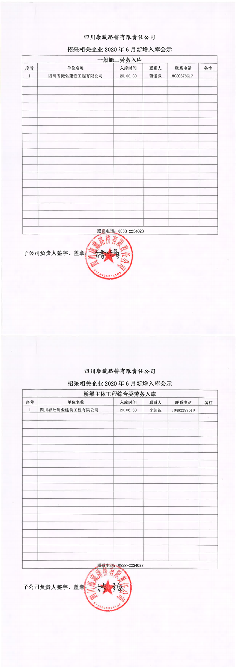 四川康藏路桥有限责任公司招采相关企业2020年6月新增入库公示