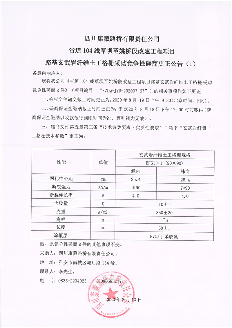 四川康藏路桥有限责任公司省道104线草坝至姚桥段改建工程项目路基玄武岩纤维土工格栅采购竞争性磋商更正公告(1)