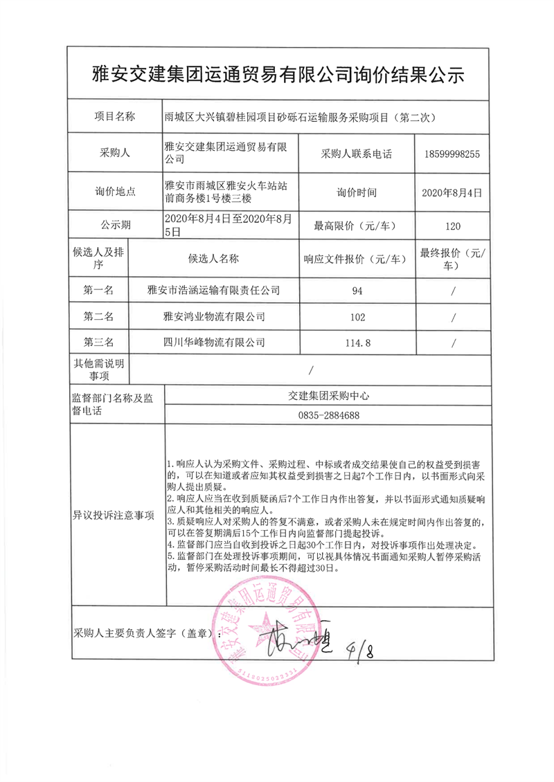 w66利来国际集团运通贸易有限公司雨城区大兴镇碧桂园项目砂砾石运输服务采购项目(第二次)询价结果公示