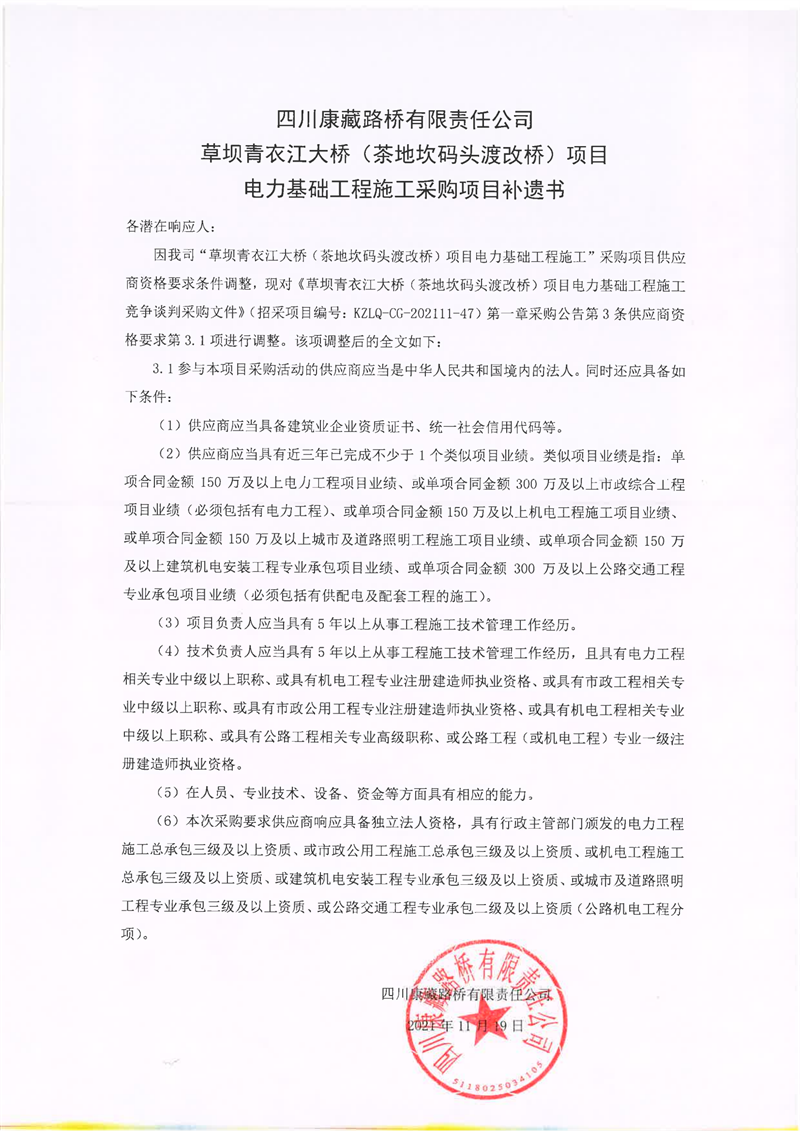 四川康藏路桥有限责任公司草坝青衣江大桥(茶地坎码头渡改桥)项目电力基础工程施工采购项目补遗书
