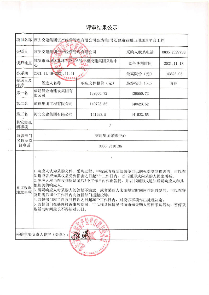 w66利来国际集团资产经营管理有限公司金鸡关1号还建路右侧山顶观景平台工程评审结果公示