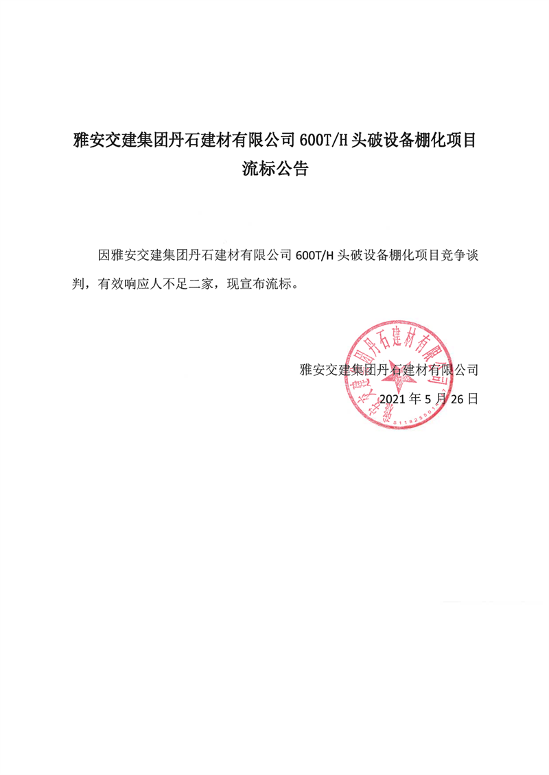 w66利来国际集团丹石建材有限公司600T/H头破设备棚化项目流标公告
