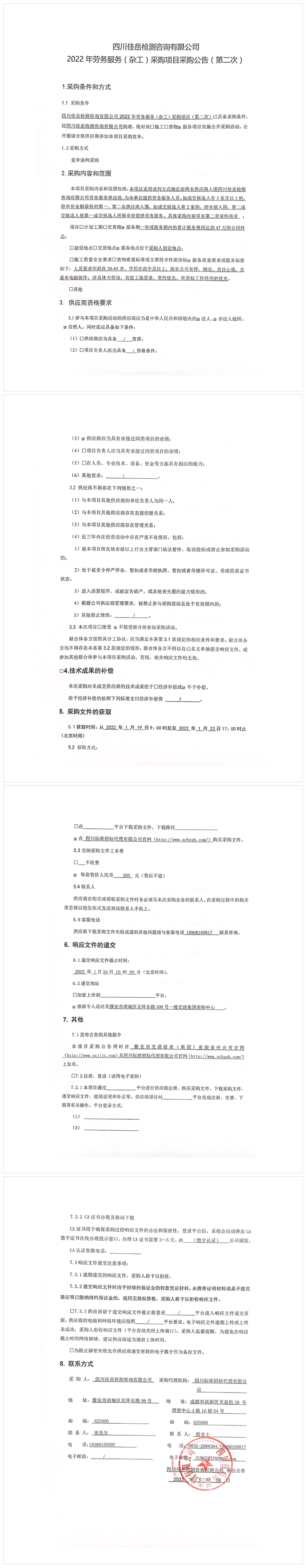 四川佳岳检测咨询有限公司2022年劳务服务(杂工)采购项目采购公告(第二次)