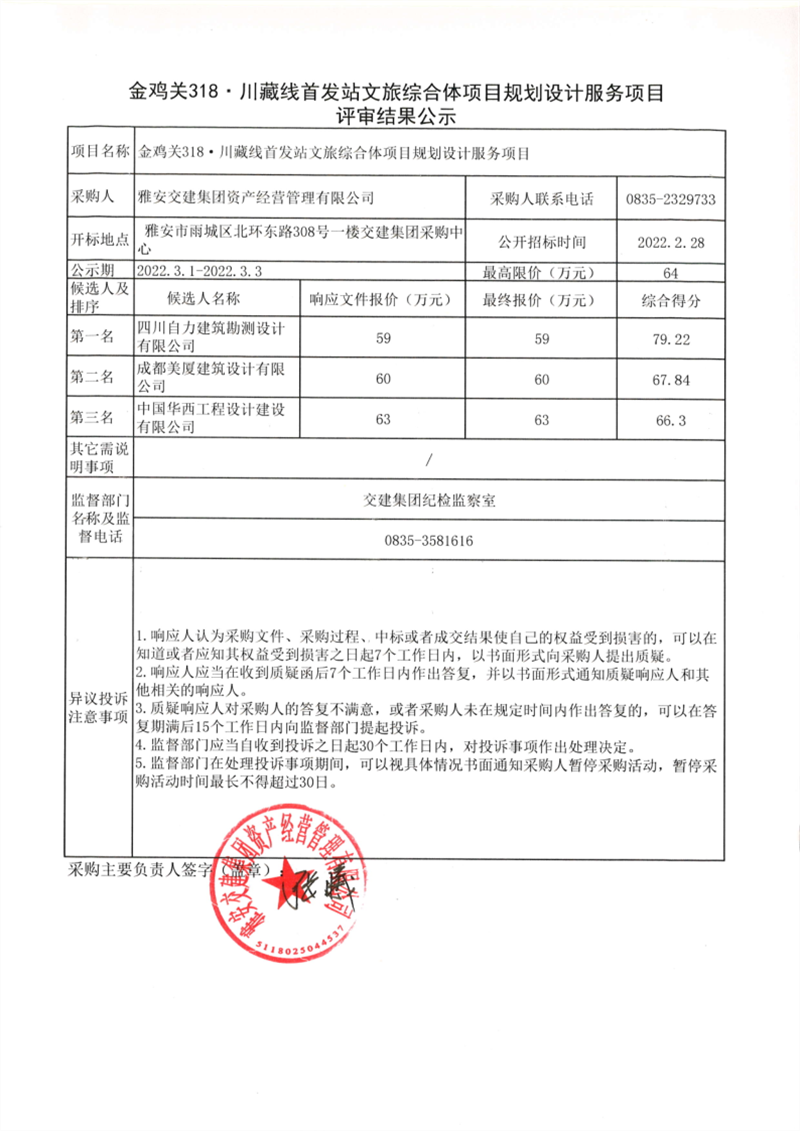 w66利来国际集团资产经营管理有限公司金鸡关318.川藏线首发站文旅综合体项目规划设计服务项目评审结果公示