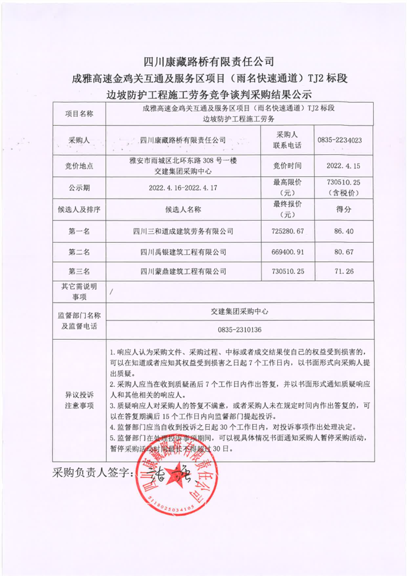 四川康藏路桥有限责任公司成雅高速金鸡关互通及服务区项目(雨名快速通道)TJ2标段边坡防护工程施工劳务竞争谈判采购结果公示