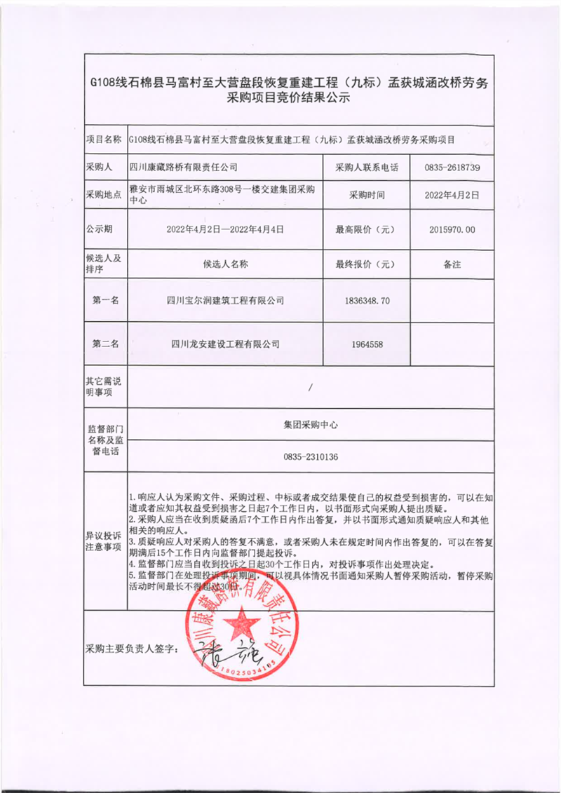 四川康藏路桥有限责任公司G108线石棉县马富村至大营盘段恢复重建工程(九标)孟获城涵改桥劳务采购项目竞价结果公示