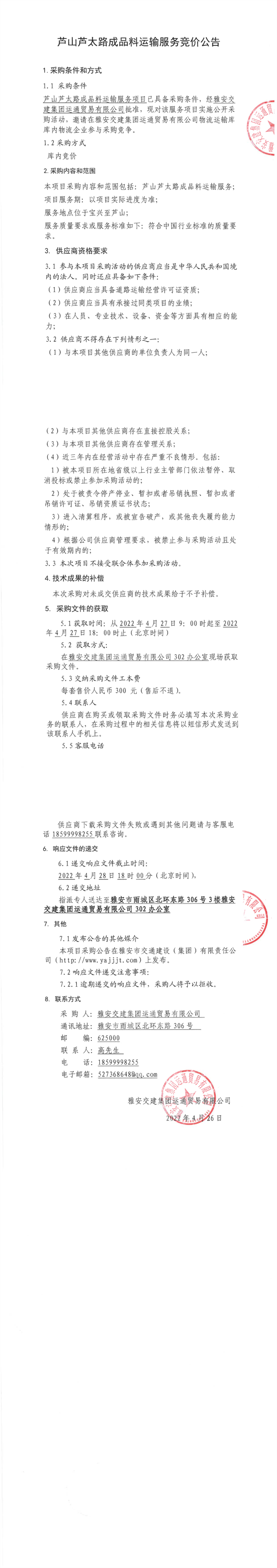 w66利来国际集团运通贸易有限公司芦山芦太路成品料运输服务竞价公告