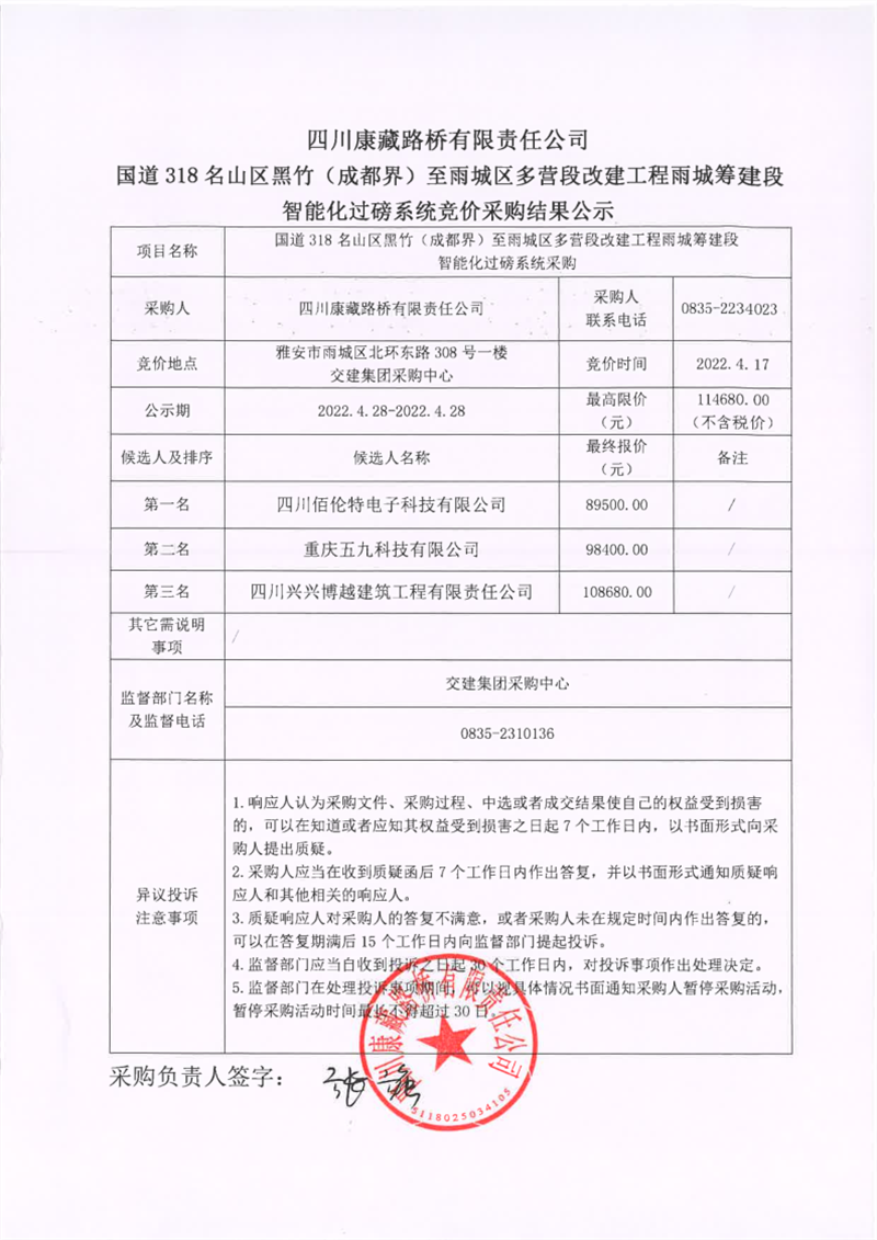 四川康藏路桥有限责任公司国道318名山区黑竹(成都界)至雨城区多营段改建工程雨城筹建段智能化过磅系统竞价采购结果公示