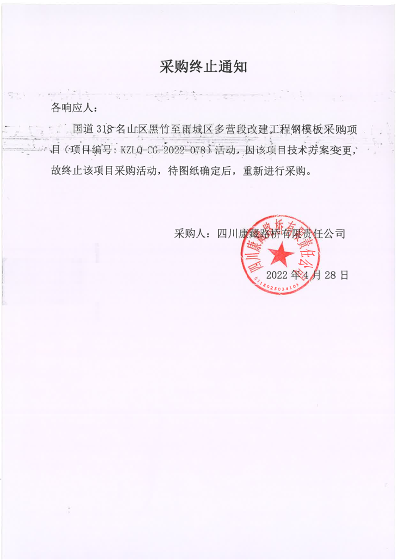四川康藏路桥有限责任公司国道318名山区黑竹至雨城区多营段改建工程钢模板采购终止通知