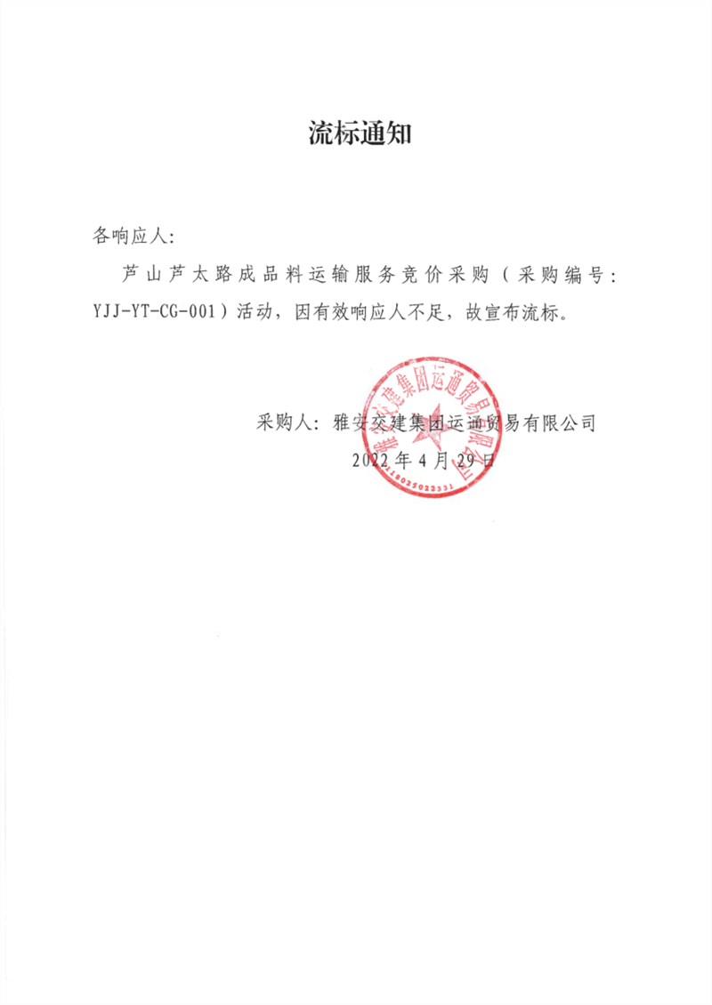 w66利来国际集团运通贸易有限公司芦山芦太路成品料运输服务竞价采购流标通知