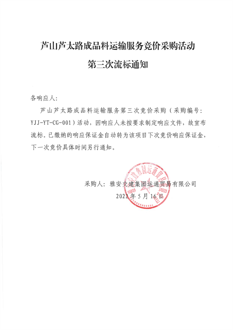 w66利来国际集团运通贸易有限公司芦山芦太路成品料运输服务竞价采购活动第三次流标通知