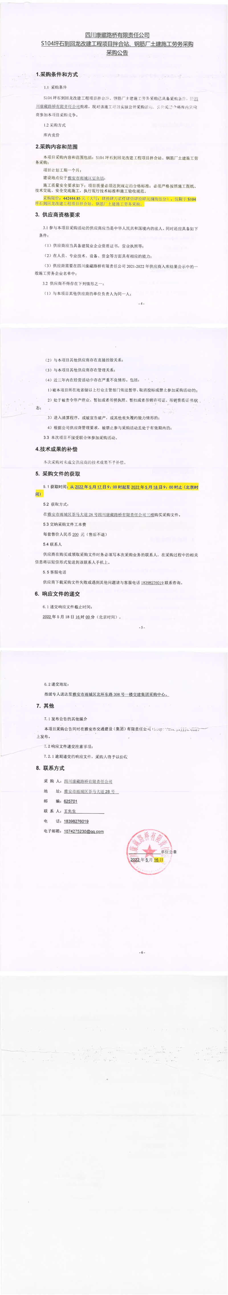 四川康藏路桥有限责任公司S104坪石到回龙改建工程项目拌合站、钢筋厂土建施工劳务采购采购公告