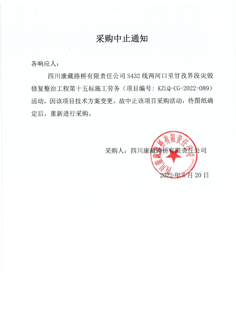 四川康藏路桥有限责任公司S432线宝兴县两河口至甘孜界段灾毁修复整治工程第十五标施工劳务采购中止通知