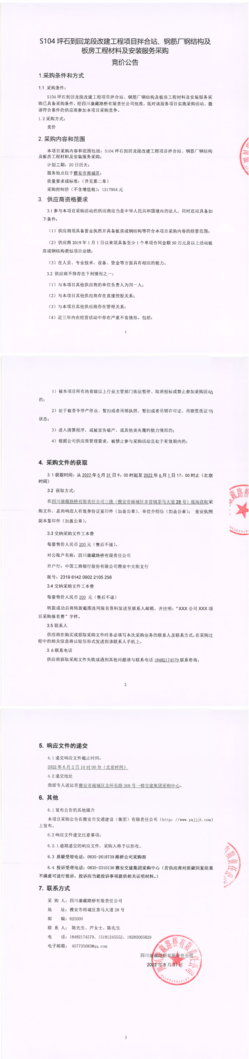 四川康藏路桥有限责任公司S104坪石到回龙段改建工程项目拌合站、钢筋厂钢结构及板房工程材料及安装服务采购竞价公告