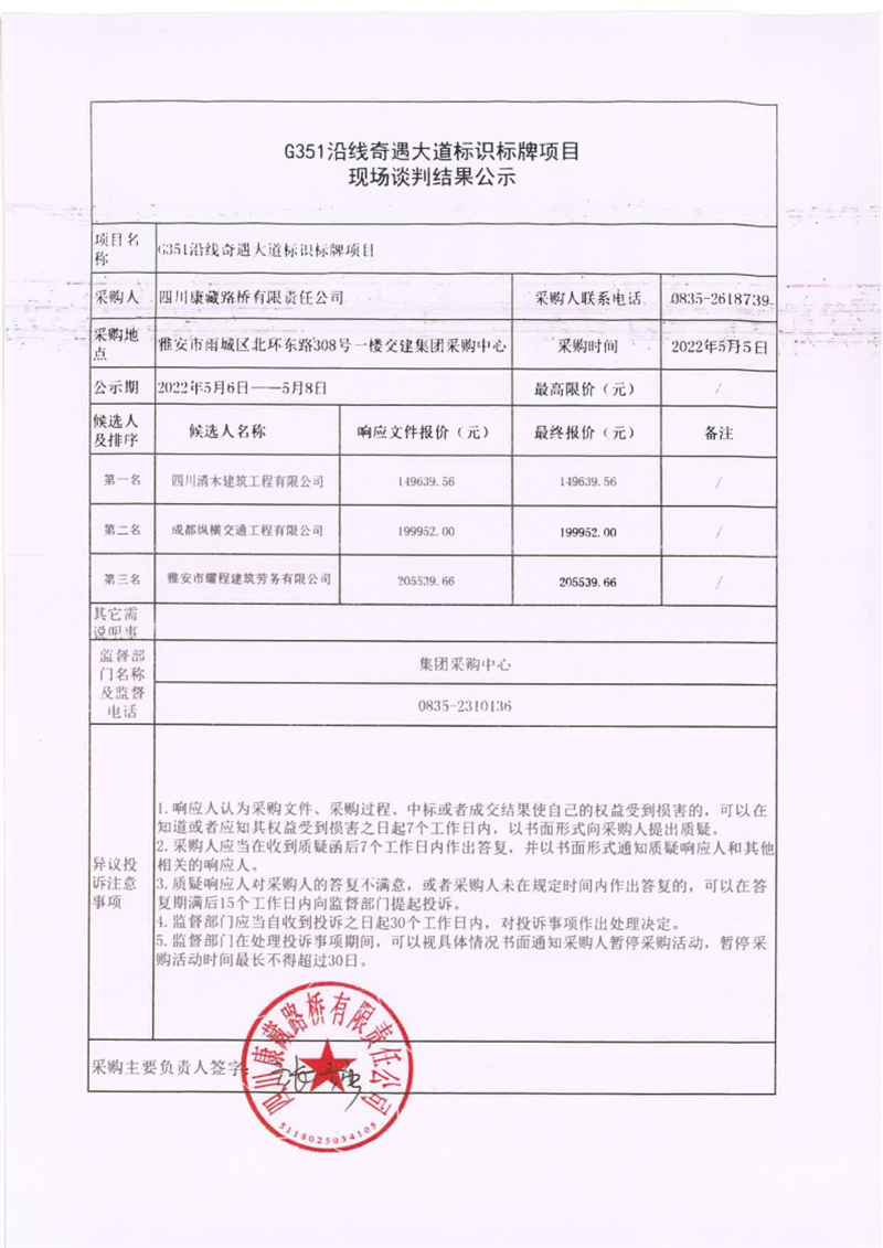 四川康藏路桥有限责任公司G351沿线奇遇大道标识标牌项目现场谈判结果公示