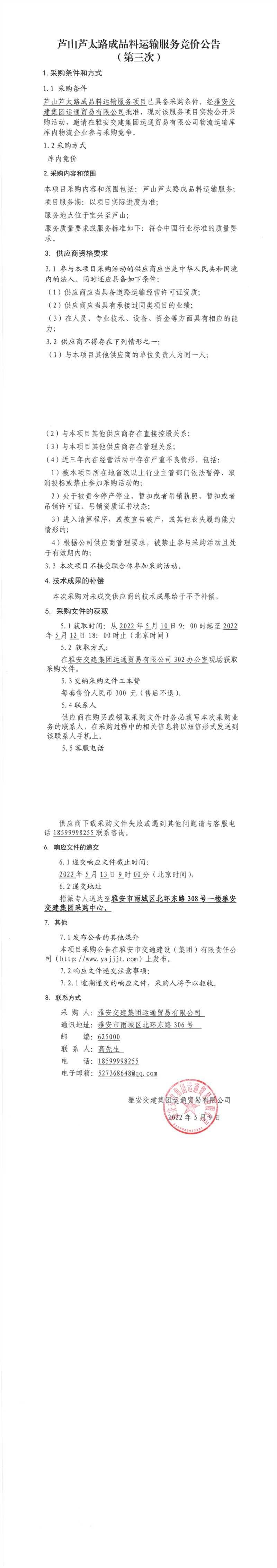w66利来国际集团运通贸易有限公司芦山芦太路成品料运输服务竞价公告(第三次)