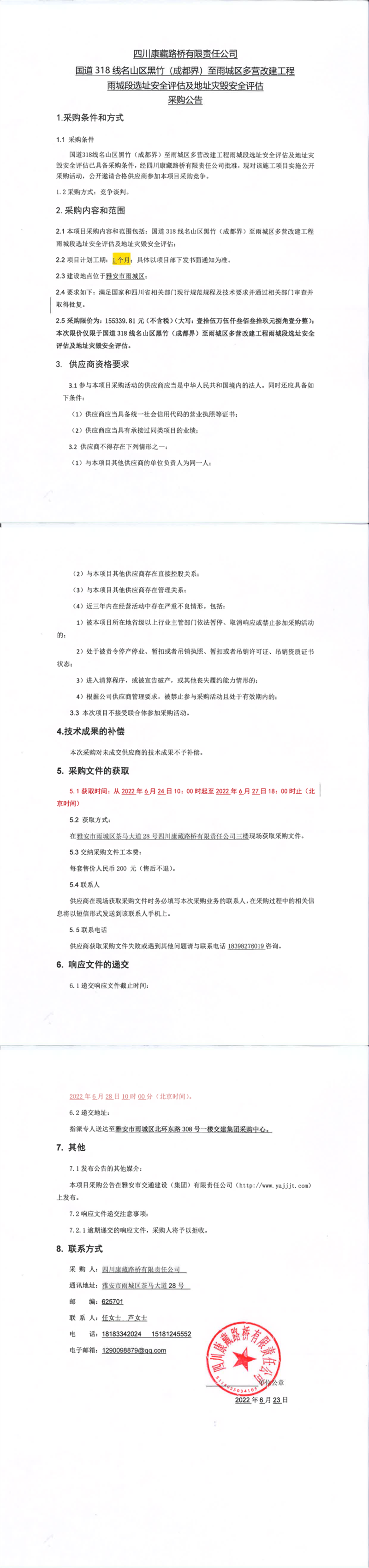 四川康藏路桥有限责任公司国道318名山区黑竹(成都界)至雨城区多营段改建工程雨城段选址安全评估及地址灾毁安全评估采购公告