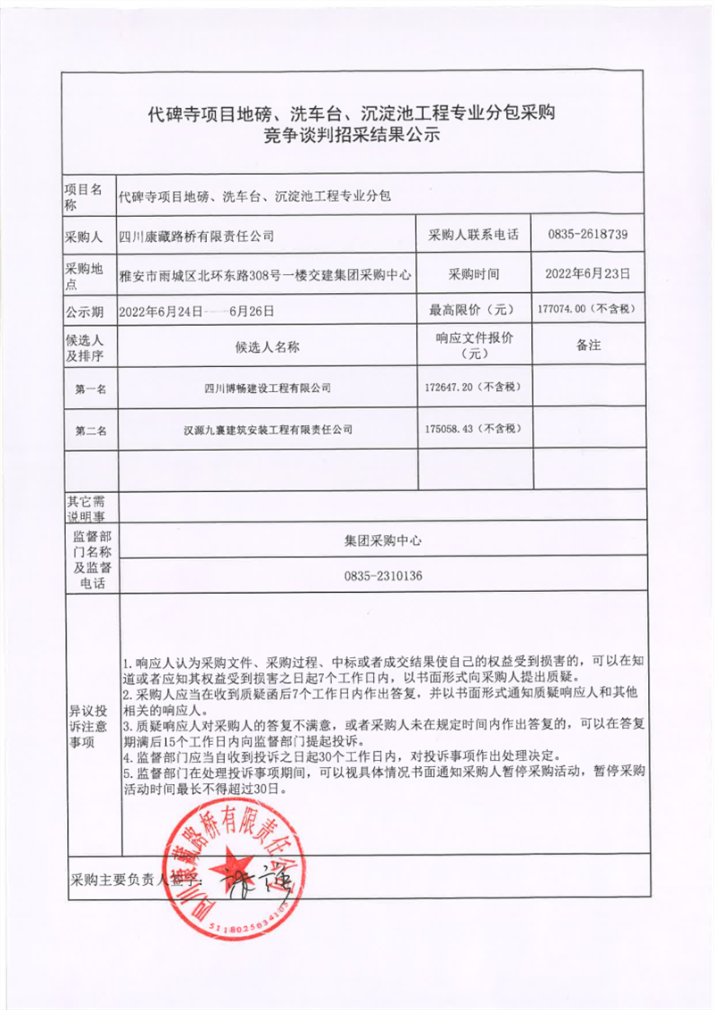 四川康藏路桥有限责任公司代碑寺项目地磅、洗车台、沉淀池工程专业分包采购竞争谈判招采结果公示