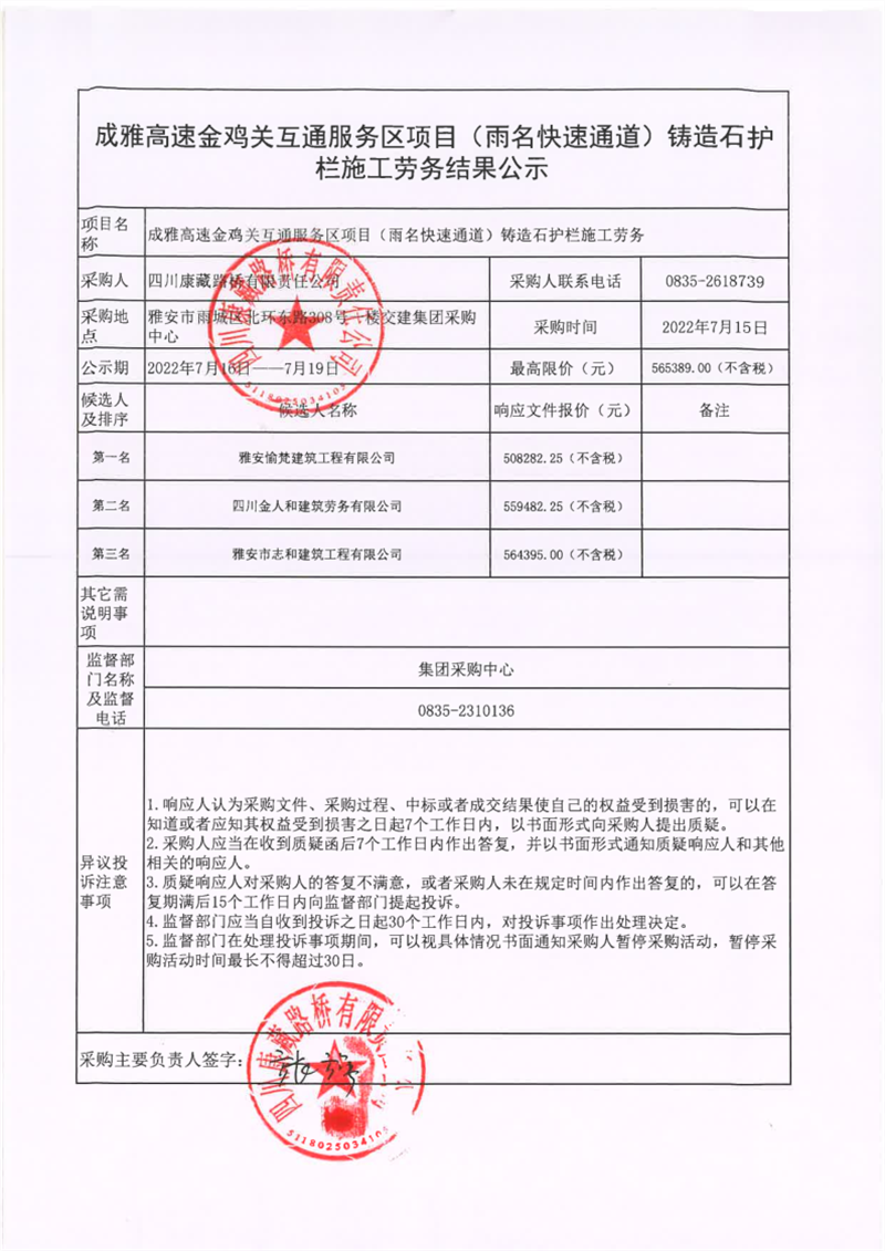 四川康藏路桥有限责任公司成雅高速金鸡关互通服务区项目(雨名快速通道)铸造石护栏工程施工劳务结果公示