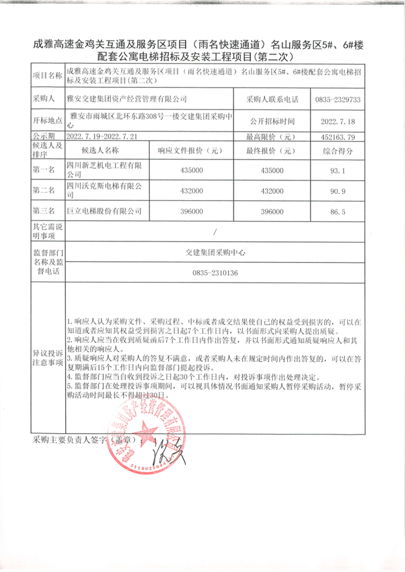 w66利来国际集团资产经营管理有限公司成雅高速金鸡关互通及服务区项目(雨名快速通道)名山服务区5#、6#楼配套公寓电梯招标及安装工程项目招标公告(第二次)结果公示