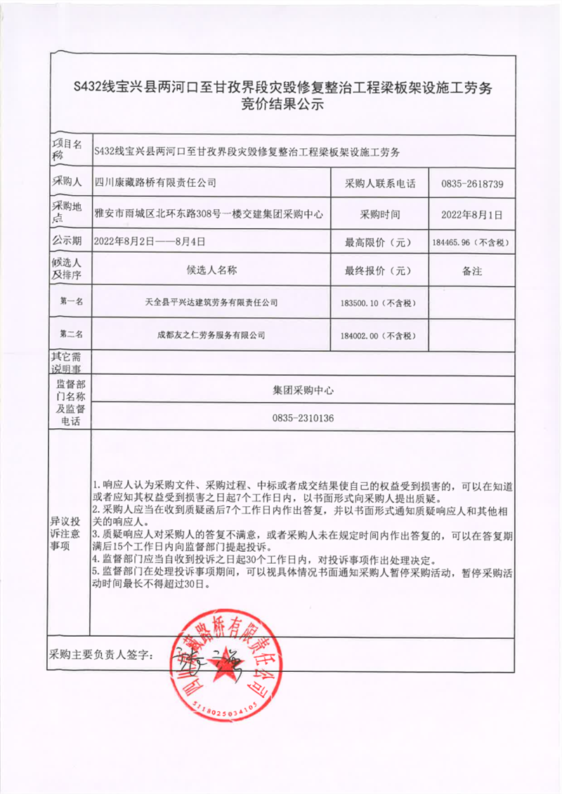 四川康藏路桥有限责任公司S432线宝兴县两河口至甘孜界段灾毁修复整治工程梁板架设施工劳务竞价结果公示
