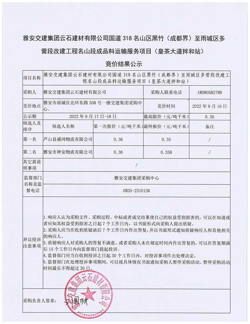 w66利来国际集团云石建材有限公司国道318名山区黑竹(成都界)至雨城区多营段改建工程雨城段成品料运输服务项目(皇茶大道拌和站)竞价结果公示