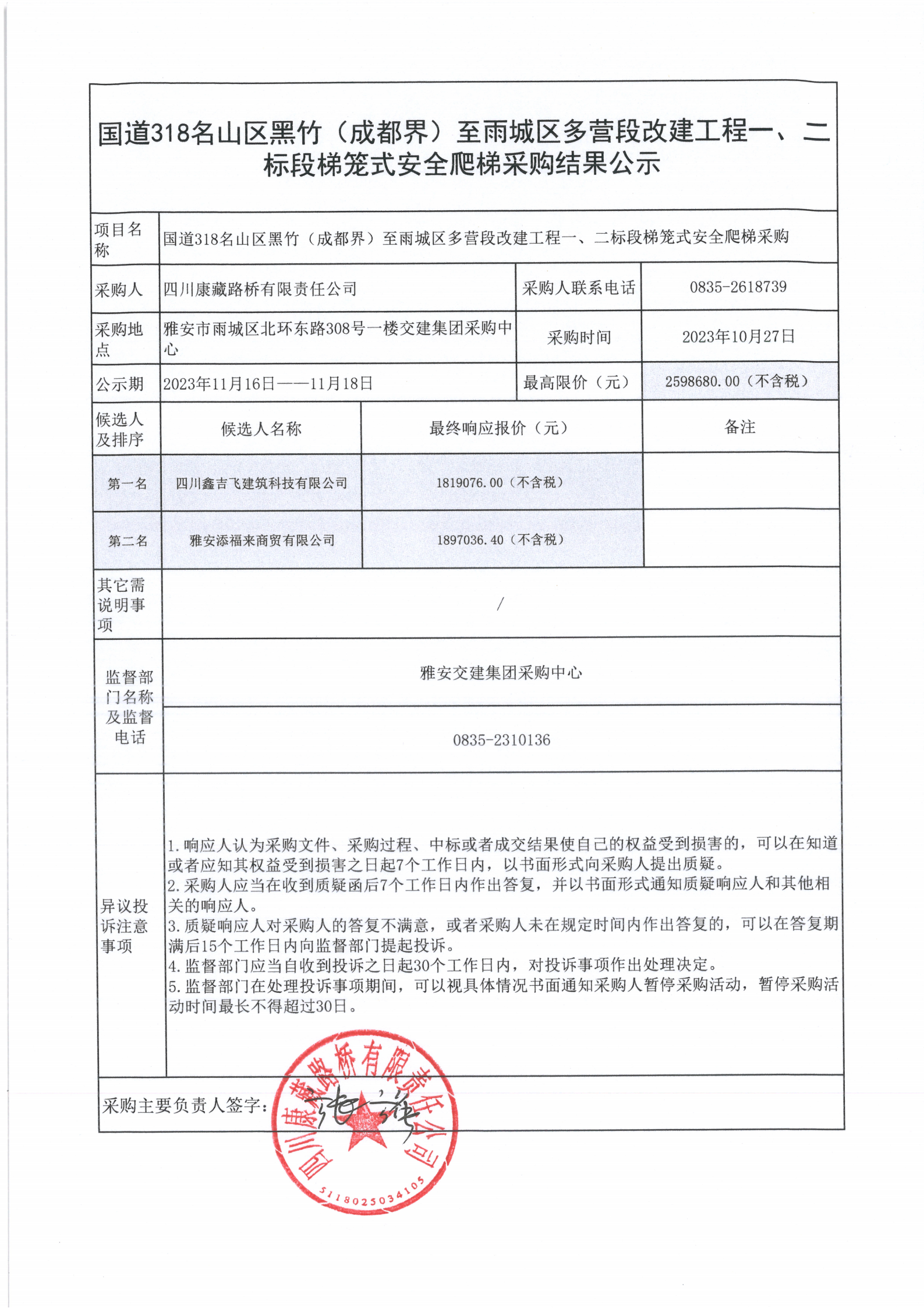 四川康藏路桥有限责任公司国道318名山区黑竹(成都界)至雨城区多营段改建工程一、二标段梯笼式安全爬梯采购结果公示