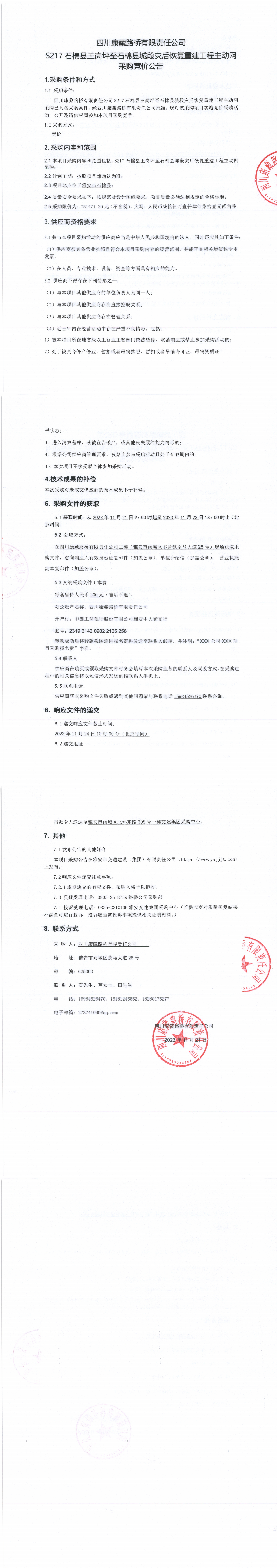 四川康藏路桥有限责任公司S217石棉县王岗坪至石棉县城段灾后恢复重建工程主动网采购公告