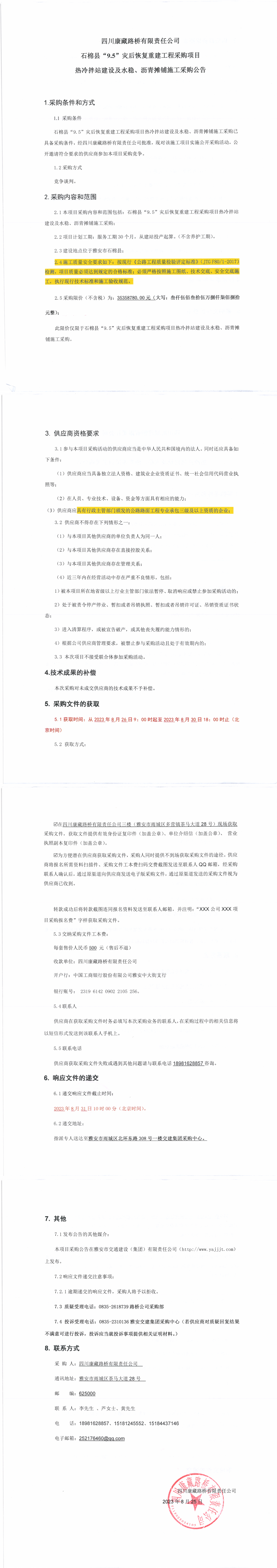 四川康藏路桥有限责任公司石棉县“9.5”灾后恢复重建工程采购项目热冷拌站建设及水稳、沥青摊铺施工采购公告