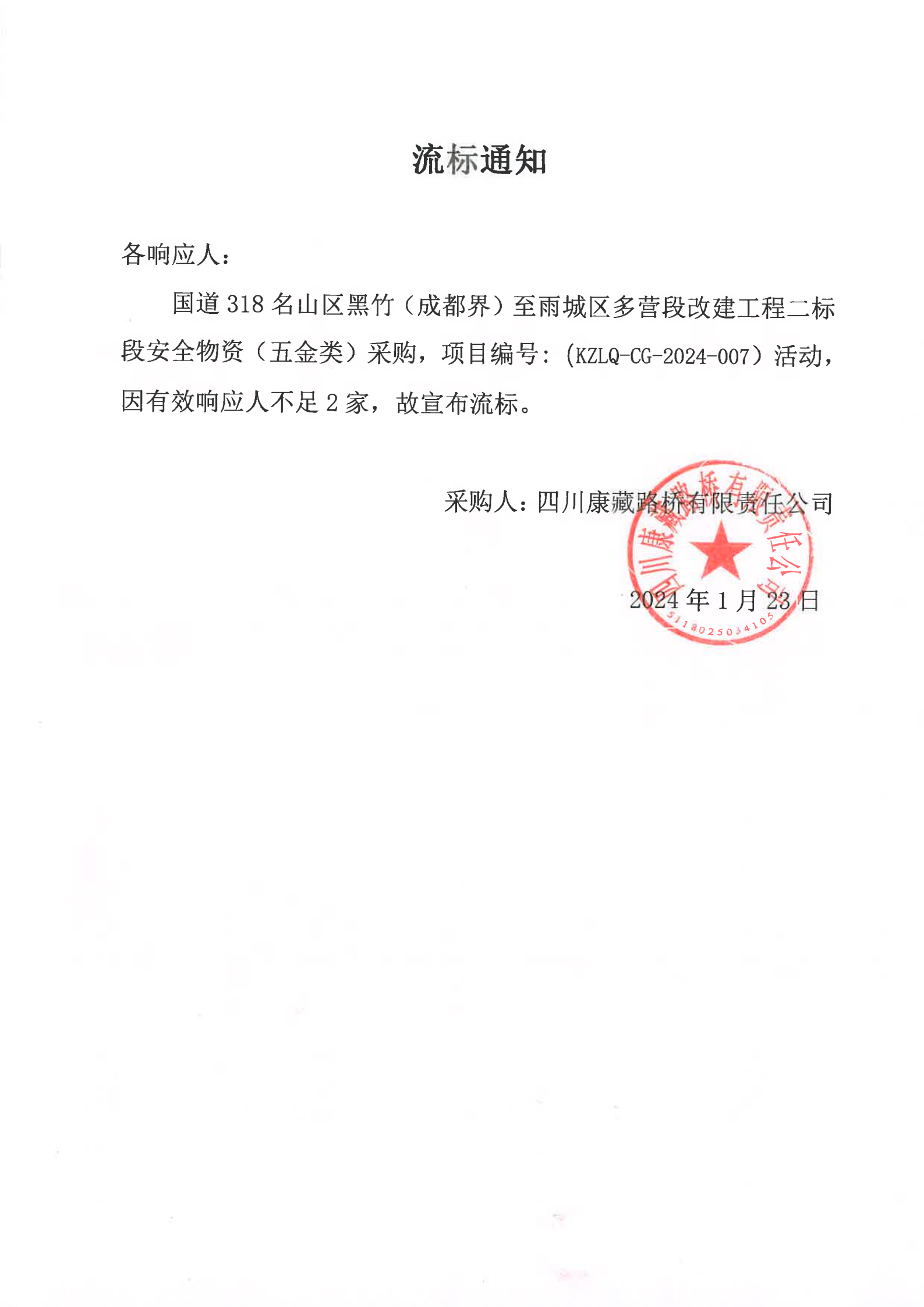 四川康藏路桥有限责任公司国道318名山区黑竹(成都界)至雨城区多营段改建工程二标段安全物资(五金类)采购流标通知