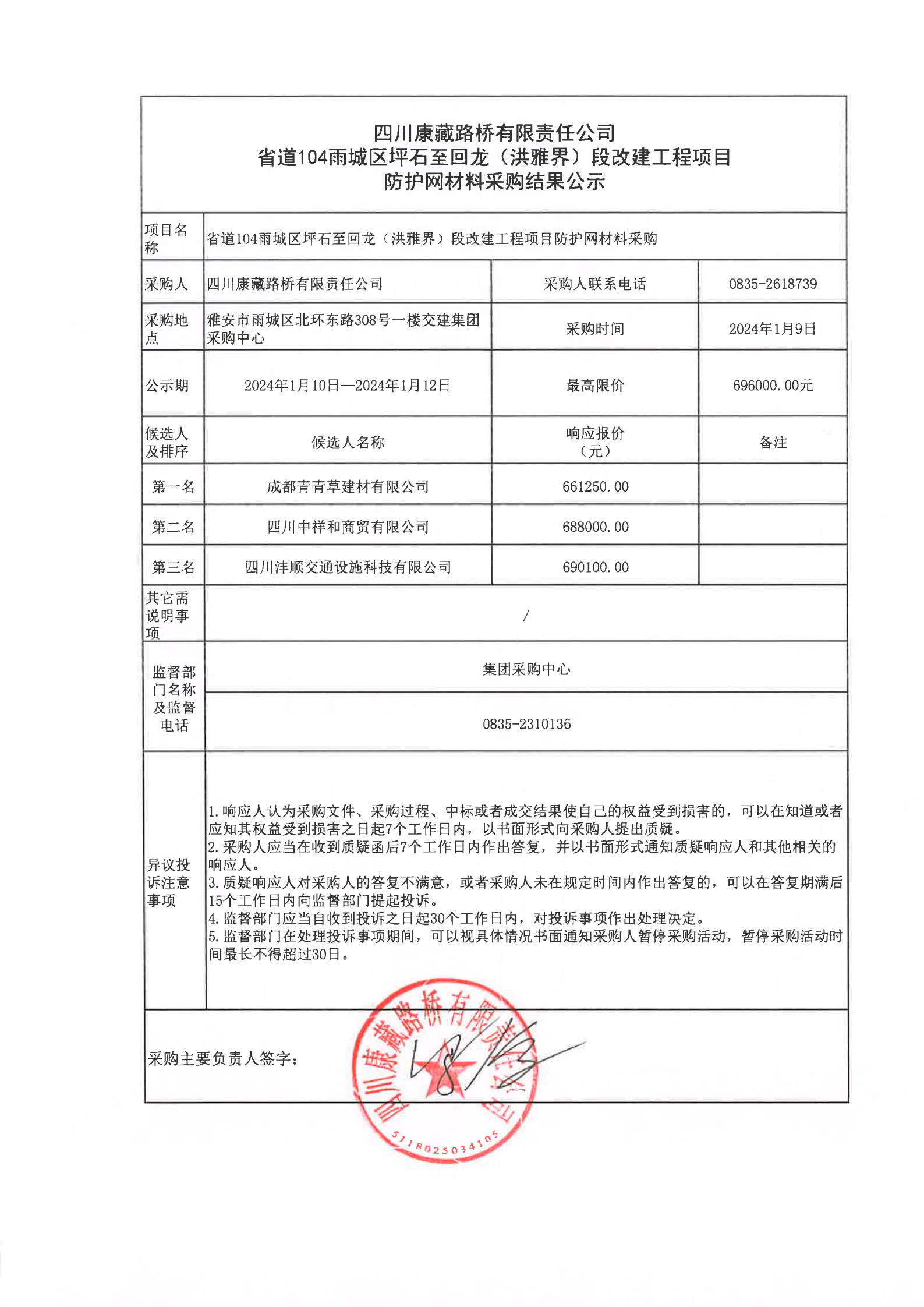 四川康藏路桥有限责任公司省道104雨城区坪石至回龙(洪雅界)段改建工程项目防护网材料采购结果公示