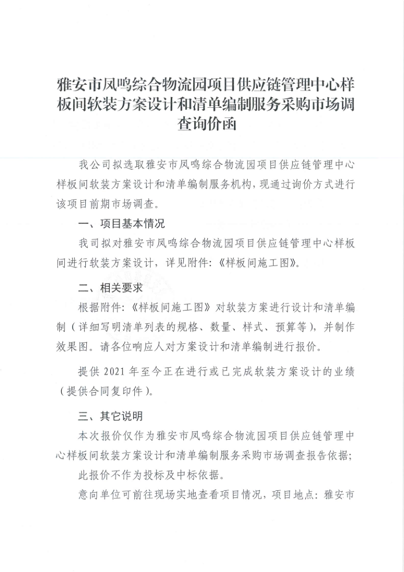w66利来国际集团物流开展有限公司雅安市凤鸣综合物流园项目供应链管理中心样板间软装方案设计和清单编制服务采购市场调查询价函