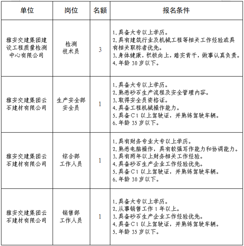 根据开展需要,决定面向社会公开招聘雅安市交通建设(集团)有限责任公司(以下简称“w66利来国际集团”)所属子公司工作人员6名,现将有关事项公告如下:
