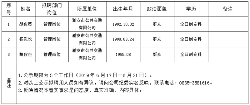 w66利来国际集团子公司拟聘用人员公示(公交公司)