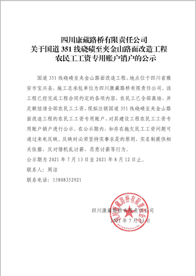 关于国道351线硗碛至夹金山路面改造工程农民工工资专用账户销户的公示