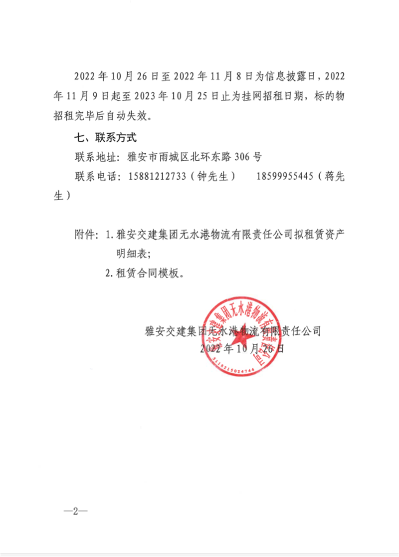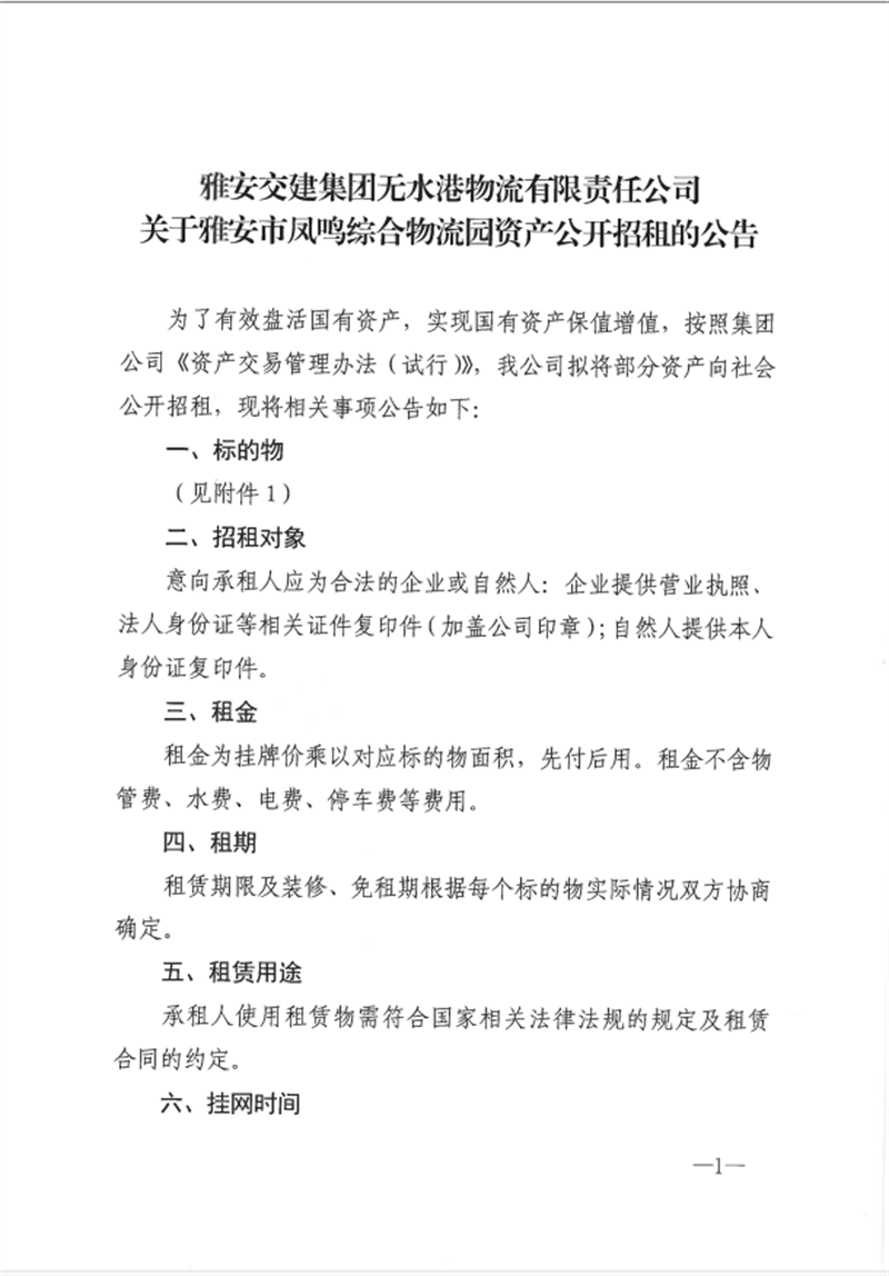 w66利来国际集团无水港物流有限责任公司关于雅安市凤鸣综合物流园资产公开招租的公告