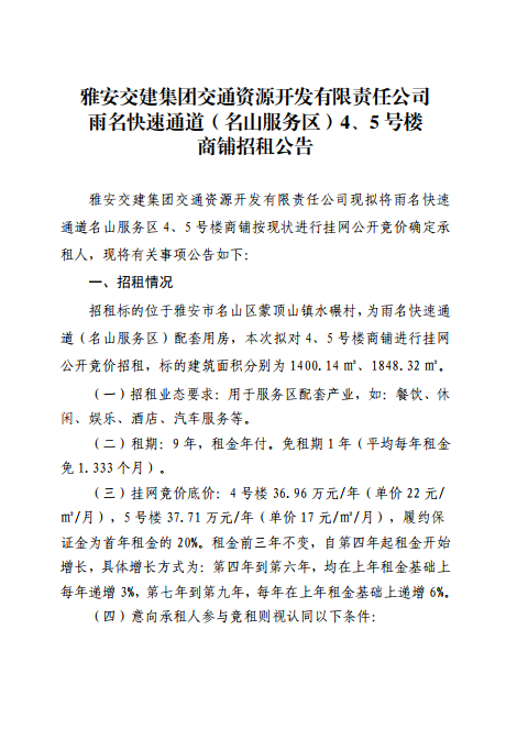 w66利来国际集团交通资源开发有限责任公司雨名快速通道(名山服务区)4、5号楼招租公告附件