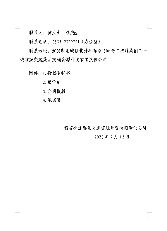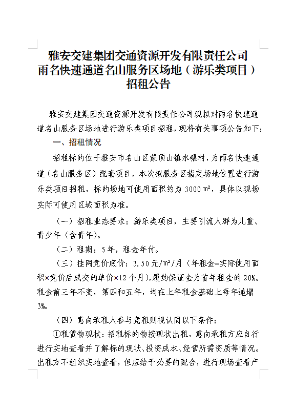 w66利来国际集团交通资源开发有限责任公司雨名快速通道名山服务区场地(游乐类项目)招租公告附件
