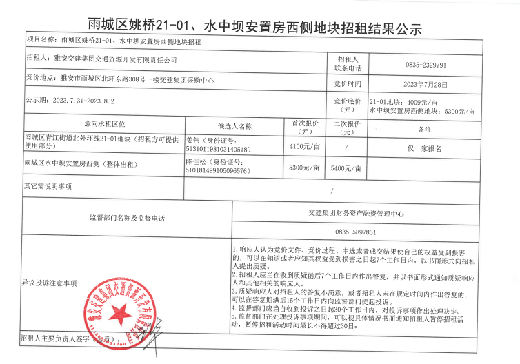 w66利来国际集团交通资源开发有限责任公司关于雅安市雨城区姚桥21-01和水中坝块块招租结果公示