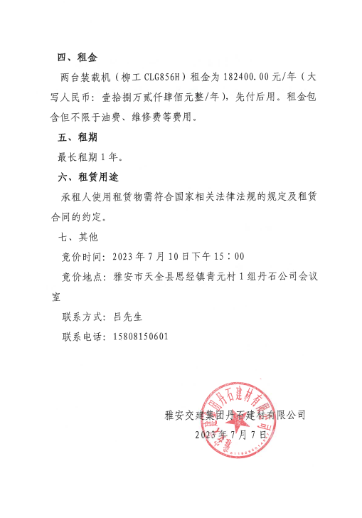 w66利来国际集团丹石建材有限公司关于2台装载机公开招租的公告附件
